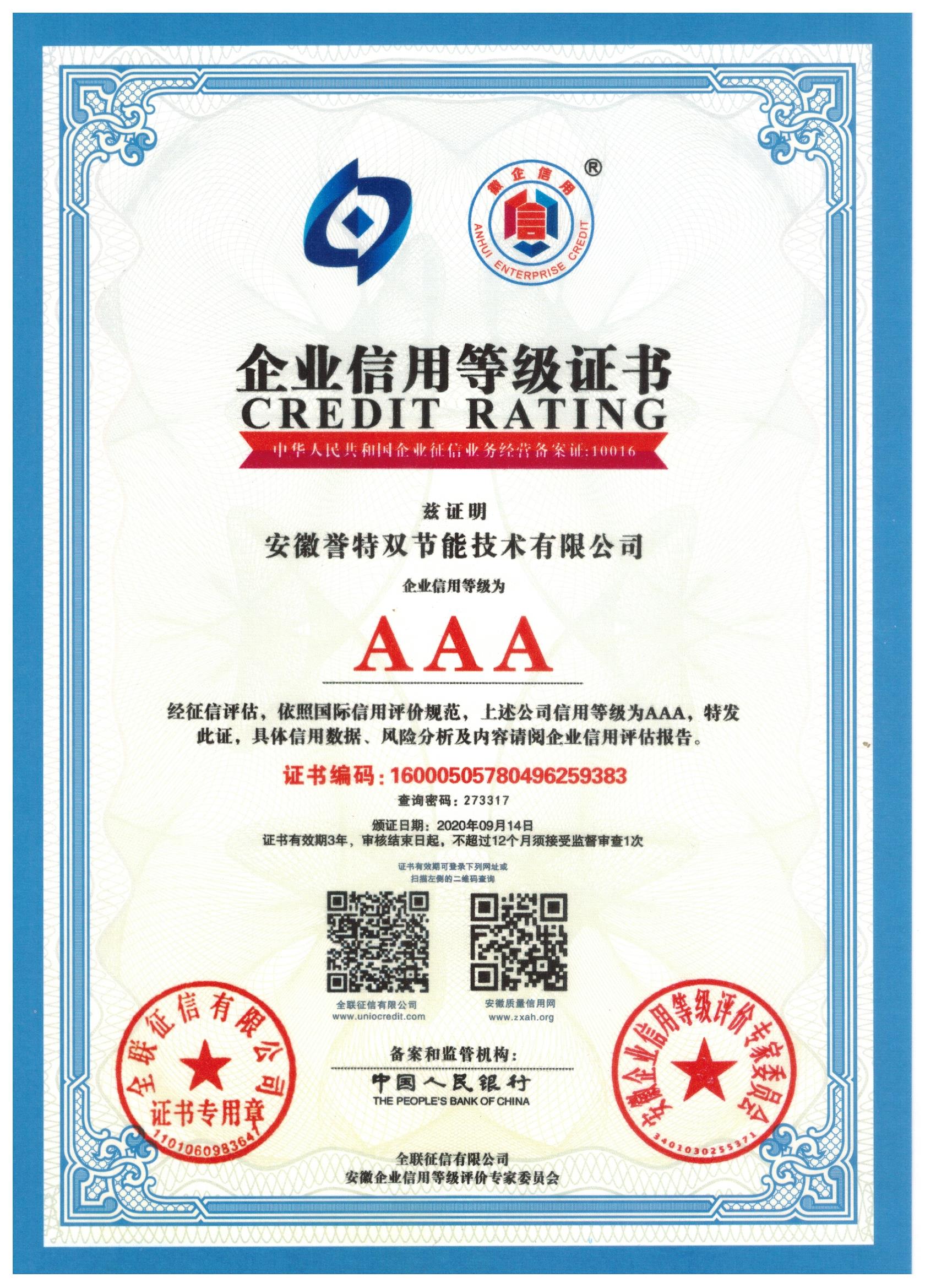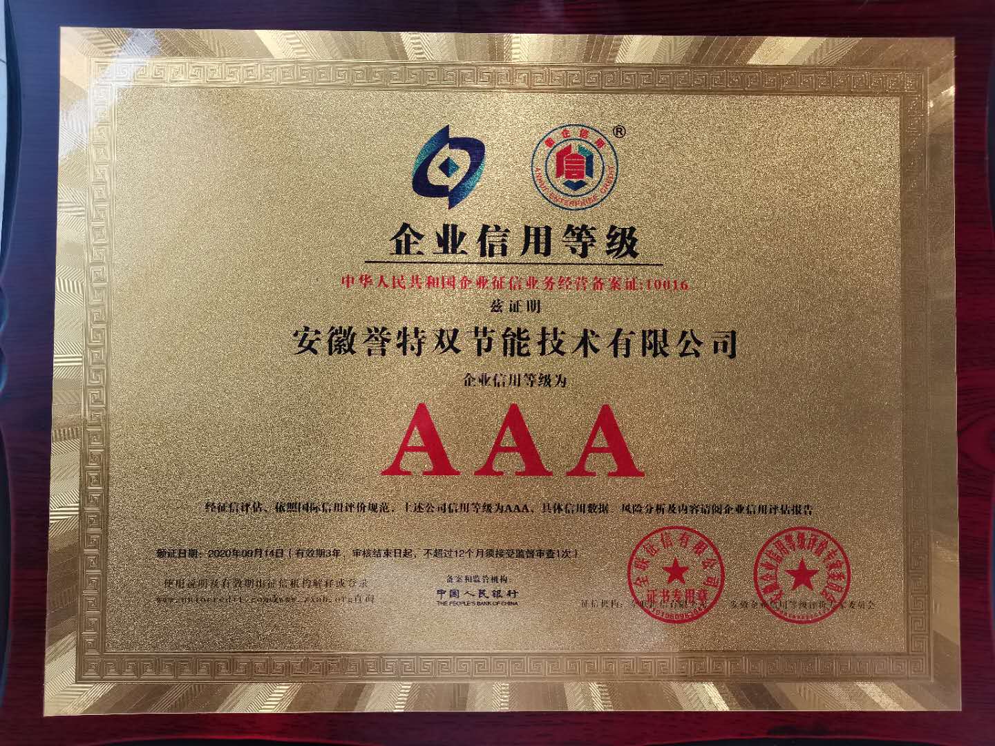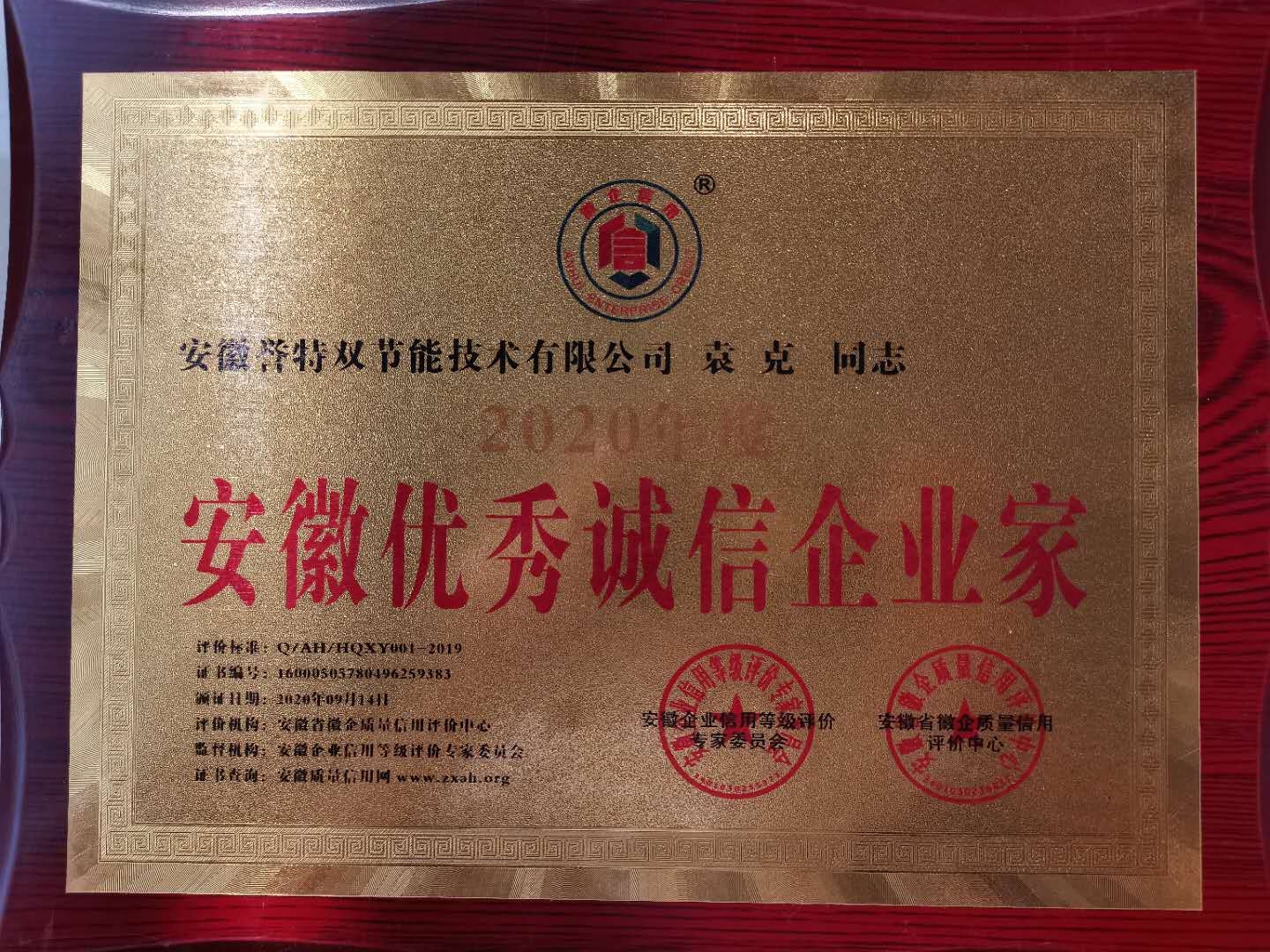 此次公司入選“安徽AAA級信用企業(yè)”,總經(jīng)理袁克同志獲評2020年度“安徽省優(yōu)秀誠信企業(yè)家”,榮譽稱號,即是榮耀,更是鞭策,公司將不斷提高企業(yè)信用建設(shè),發(fā)揮企業(yè)信譽優(yōu)勢,為國家節(jié)能環(huán)保事業(yè)做出更大的貢獻(xiàn)!