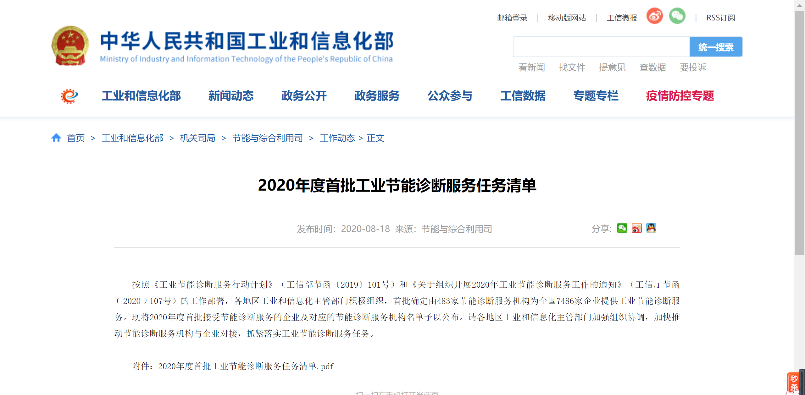 2020年7月,我公司中標工業(yè)和信息化部節(jié)能與綜合利用司——2020年度節(jié)能診斷服務機構選聘項目。