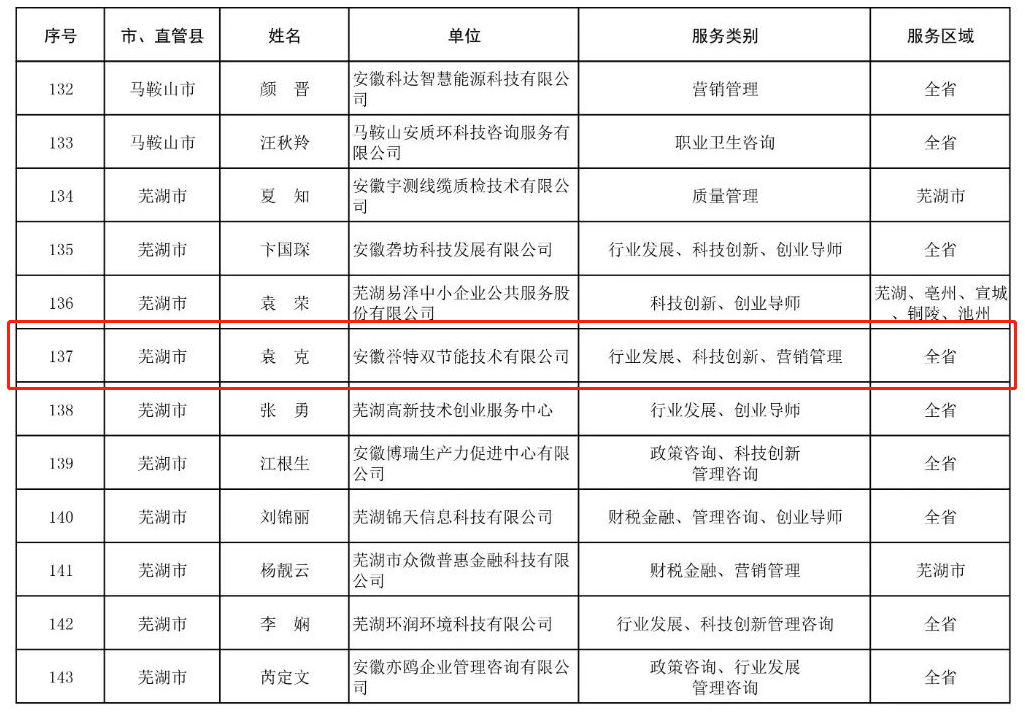 7月13日,安徽省中小企業(yè)志愿服務(wù)專(zhuān)家名單第一批,經(jīng)省經(jīng)信廳、省民政廳審核、認(rèn)定,并正式予以公布。我公司總經(jīng)理袁克同志榮登榜單,喜獲認(rèn)定,同時(shí)也是蕪湖市唯一的節(jié)能環(huán)保產(chǎn)業(yè)入選單位。