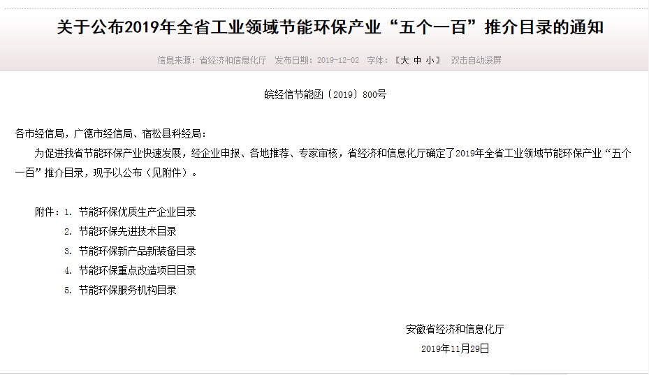 熱烈祝賀我公司入選安徽省2019年度全省工業(yè)領域節(jié)能環(huán)保產(chǎn)業(yè)“五個一百”推介目錄