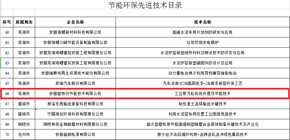 12月2日,安徽省經(jīng)濟和信息化廳發(fā)布了2019年全省工業(yè)領域節(jié)能環(huán)保產(chǎn)業(yè)“五個一百”推介目錄公告,安徽譽特雙節(jié)能技術有限公司入選《節(jié)能環(huán)保服務機構目錄(2019)》,也是蕪湖市唯一的入選單位,同時公司節(jié)能技術“工業(yè)蒸汽輪機技改提效節(jié)能技術”入選《節(jié)能環(huán)保先進技術目錄(2019)》。