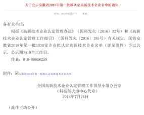 2018年7月24日,國家科技部全國高新技術(shù)企業(yè)認定管理工作領(lǐng)導(dǎo)小組辦公室,通過科技部火炬中心官網(wǎng)發(fā)布——安徽省2018年第一批國家級高新技術(shù)企業(yè)認定名單的公示通知,我公司安徽譽特雙節(jié)能技術(shù)有限公司榜上有名,目前已順利通過公示,正式予以認定,公司在此表示熱烈祝賀!