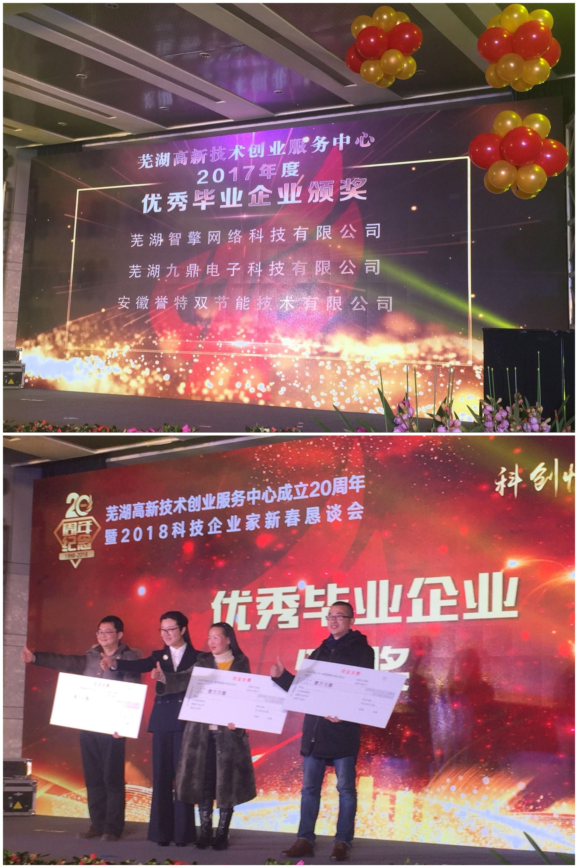 近日,我公司安徽譽特雙節(jié)能技術(shù)有限公司,榮獲蕪湖市國家級高新技術(shù)創(chuàng)業(yè)園區(qū)“2017年優(yōu)秀畢業(yè)創(chuàng)業(yè)企業(yè)”榮譽稱號。