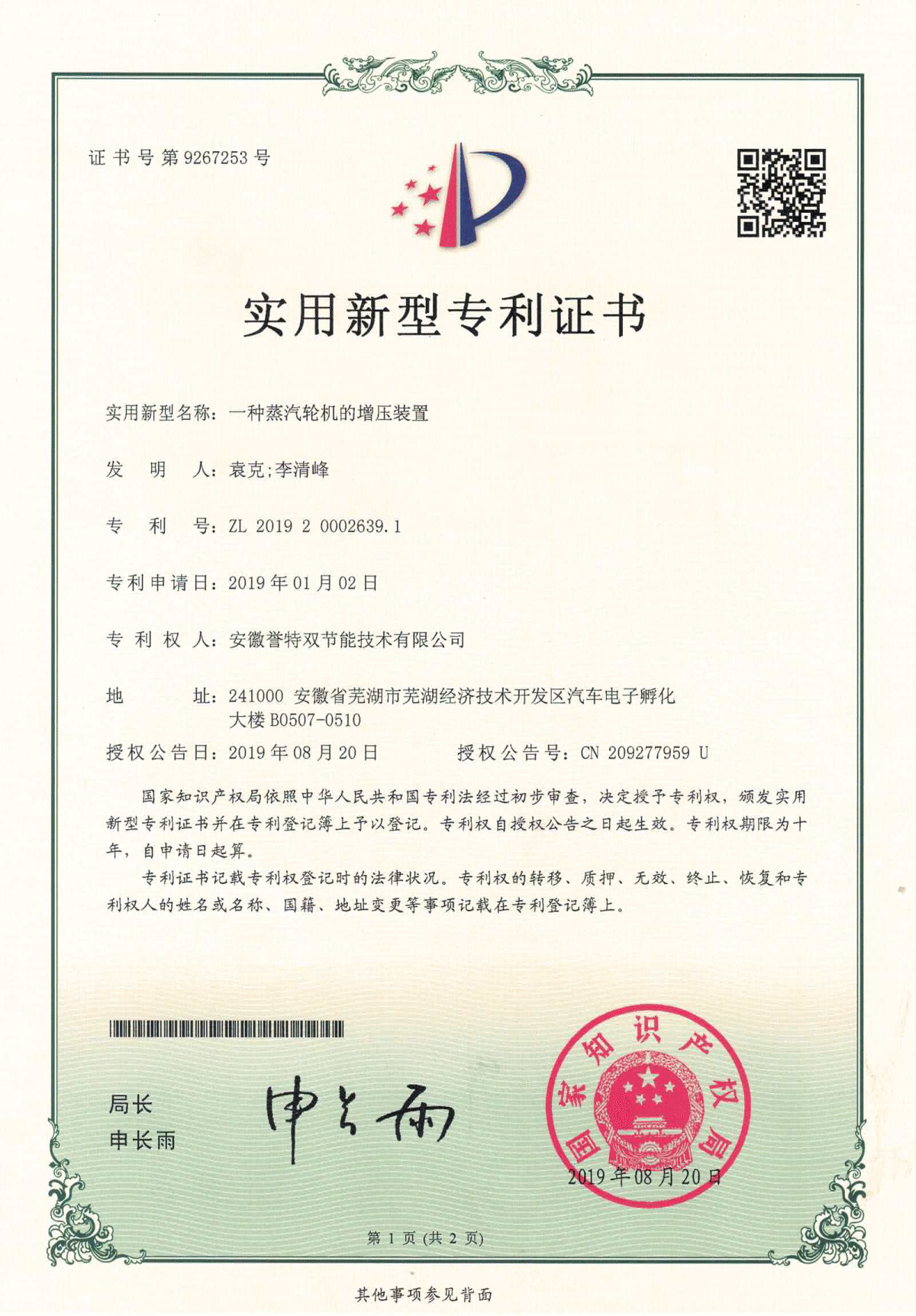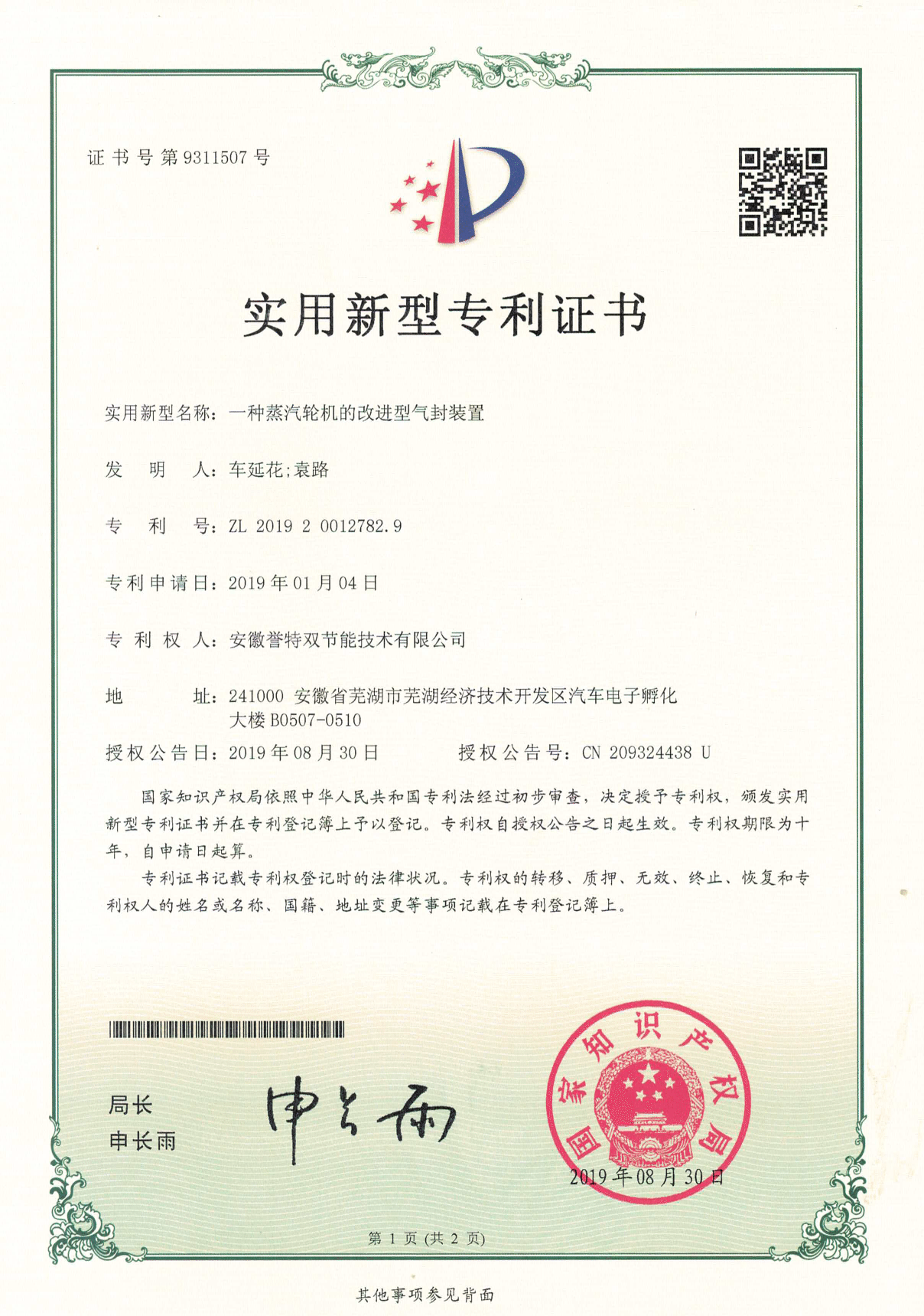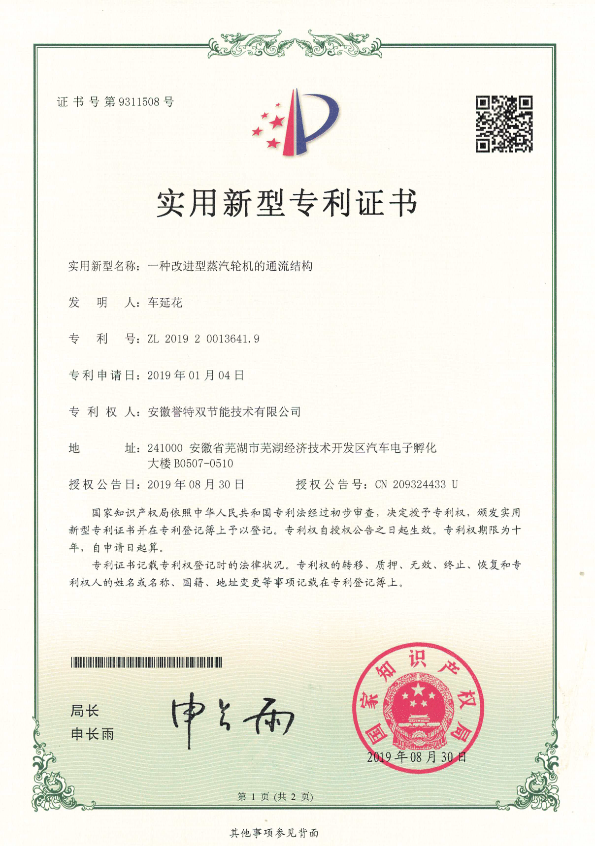 近日,我公司申報的“一種改進型蒸汽輪機的通流結(jié)構(gòu)”、“一種蒸汽輪機的增壓裝置”、“一種蒸汽輪機的改進型氣封裝置”等10項實用新型專利通過國家知識產(chǎn)權(quán)局審核,并順利獲取實用新型專利證書。