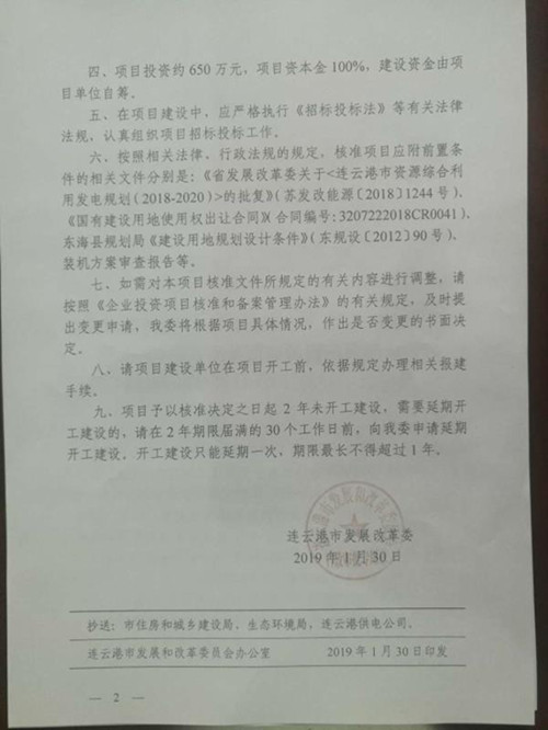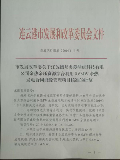 該項目當(dāng)前進展順利,經(jīng)大力推動,已順利獲取《江蘇省發(fā)展改革委關(guān)于<連云港市資源綜合利用發(fā)電規(guī)劃(2018-2020)>的批復(fù)》(蘇發(fā)改能源〔2018〕1244號)、《連云港市發(fā)展改革委關(guān)于江蘇德邦多菱健康科技有限公司余熱余壓資源綜合利用0.6MW余熱發(fā)電合同能源管理項目核準(zhǔn)的批復(fù)》(連發(fā)改行服發(fā)〔2019〕13號)、《東??h發(fā)改委關(guān)于報請核準(zhǔn)江蘇德邦多菱健康科技有限公司余熱余壓資源綜合利用0.6MW余熱發(fā)電項目的請示》(東發(fā)改發(fā)〔2019〕3號)、《裝機方案審查報告》等文件和項目核準(zhǔn)批文。