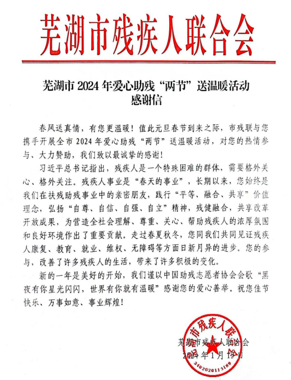 2024年1月18日,蕪湖市愛心助殘“兩節(jié)”送溫暖活動(dòng)啟動(dòng)大會(huì)舉行,全市數(shù)10家商協(xié)會(huì)及部分愛心單位,市殘聯(lián)五大協(xié)會(huì)以及困難殘疾人代表參加儀式,為全市各縣市區(qū)的100名困難重度殘疾人及其家庭現(xiàn)場(chǎng)送溫暖,與困難殘疾人共度寒冬。會(huì)后,市殘聯(lián)為各商協(xié)會(huì)及愛心企業(yè)送來(lái)感謝信,對(duì)愛心企業(yè)的捐贈(zèng)表示衷心感謝!