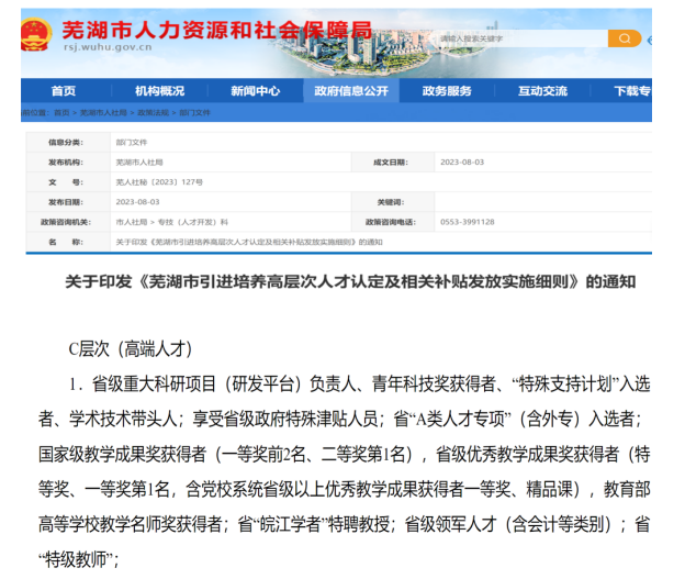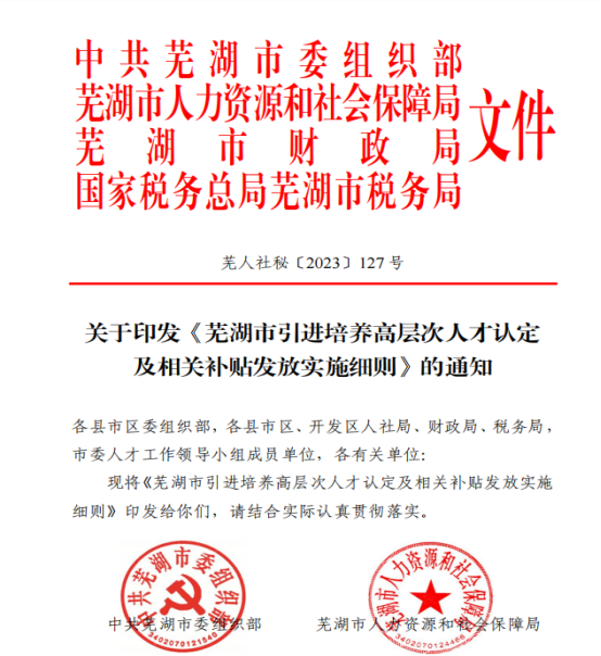 根據中共蕪湖市委組織部、蕪湖市人社局、財政局、稅務局聯合發(fā)布的《蕪湖市引進培養(yǎng)高層次人才認定及相關補貼發(fā)放實施細則》文件。