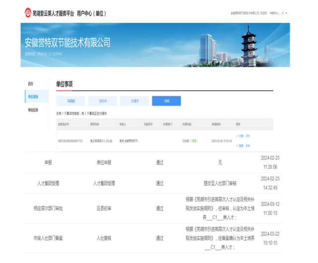 2024年3月22日,經我公司自主申報,結合袁克個人榮譽資質---安徽省委組織部第八批特支計劃領軍人才、安徽省人社廳第八批戰(zhàn)略性新興產業(yè)技術領軍人才等認定基礎上,通過蕪湖市人才集團評定,區(qū)縣人社部門審核,市人社局備案,我公司總經理袁克同志喜獲蕪湖市高層次C1類人才認定,并可按規(guī)定享受相應的住房、教育、醫(yī)療、人才津貼等優(yōu)惠獎補政策。