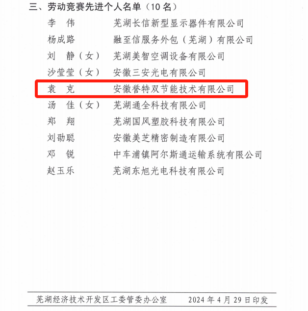 2024年4月29日,中共蕪湖經(jīng)濟(jì)技術(shù)開發(fā)區(qū)工委、蕪湖經(jīng)濟(jì)技術(shù)開發(fā)區(qū)管委會發(fā)布《關(guān)于授予2023年度經(jīng)開區(qū)勞動競賽先進(jìn)集體、先進(jìn)班組、先進(jìn)個人稱號》通知文件,我公司總經(jīng)理袁克榮獲“先進(jìn)個人”榮譽稱號,在此表示熱烈祝賀。