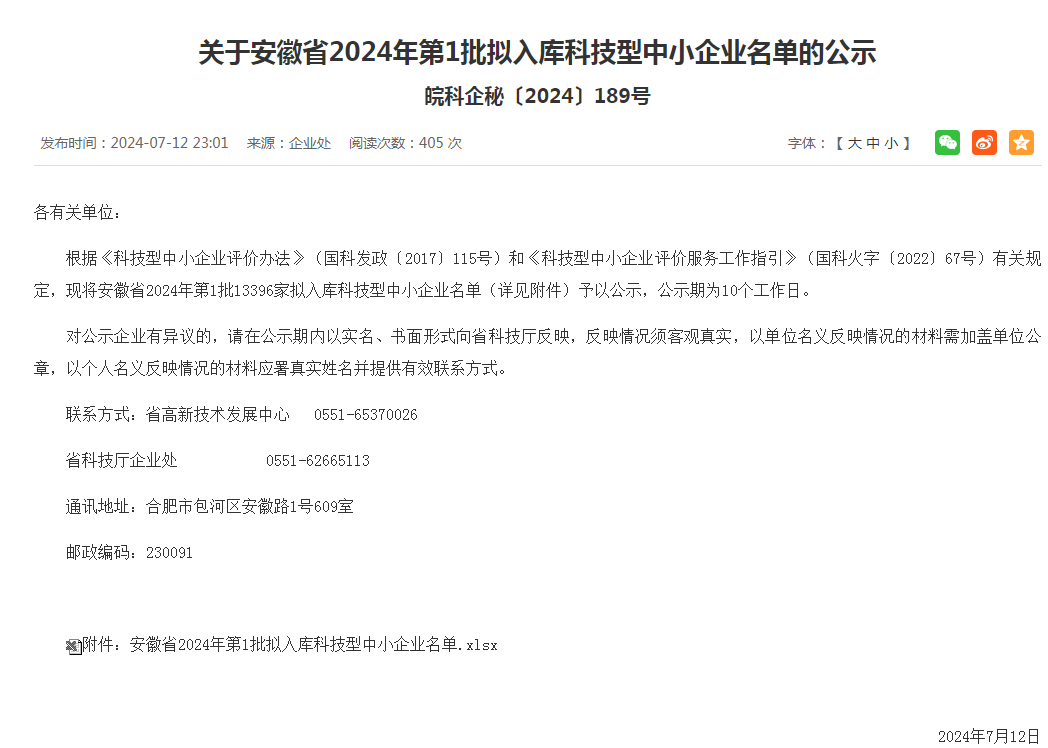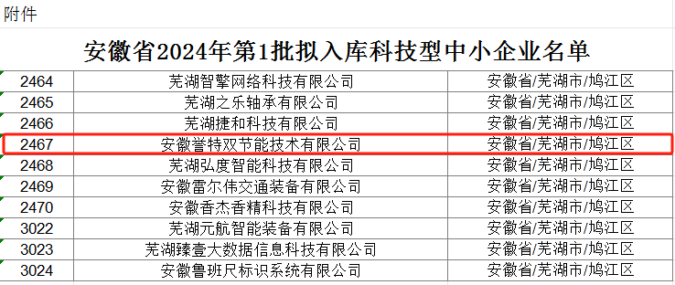 近日,根據(jù)《工業(yè)和信息化部辦公廳關(guān)于開展2024年度科技型中小企業(yè)評價工作的通知》(工信廳企業(yè)函﹝2024﹞244號)要求,通過企業(yè)評價、政府科技部門逐層審核,安徽省科學(xué)技術(shù)廳最終發(fā)布2024年第1批入庫科技型中小企業(yè)名單,我公司榮列榜單,在此表示祝賀。