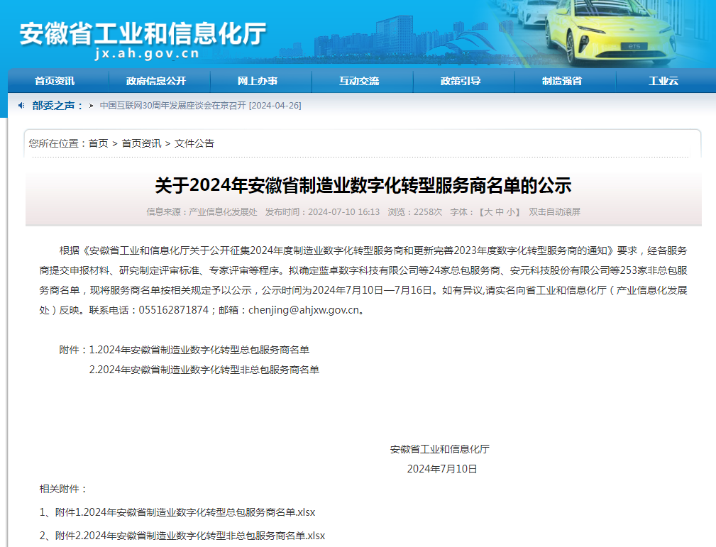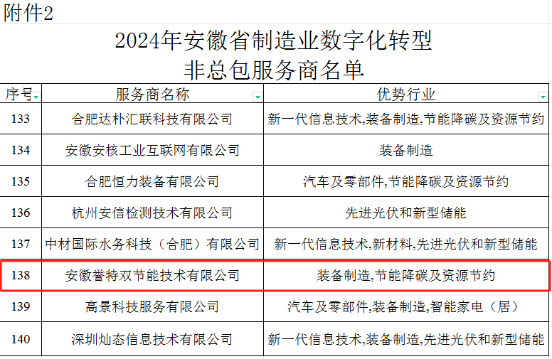 近日,根據(jù)《安徽省工業(yè)和信息化廳關于公開征集2024年度制造業(yè)數(shù)字化轉型服務商和更新完善2023年度數(shù)字化轉型服務商的通知》要求,經各服務商提交申報材料、研究制定評審標準、專家評審等程序,由安徽省工業(yè)和信息化廳發(fā)布2024年安徽省制造業(yè)數(shù)字化轉型服務商名單,我公司名列其中,在此表示熱烈祝賀!