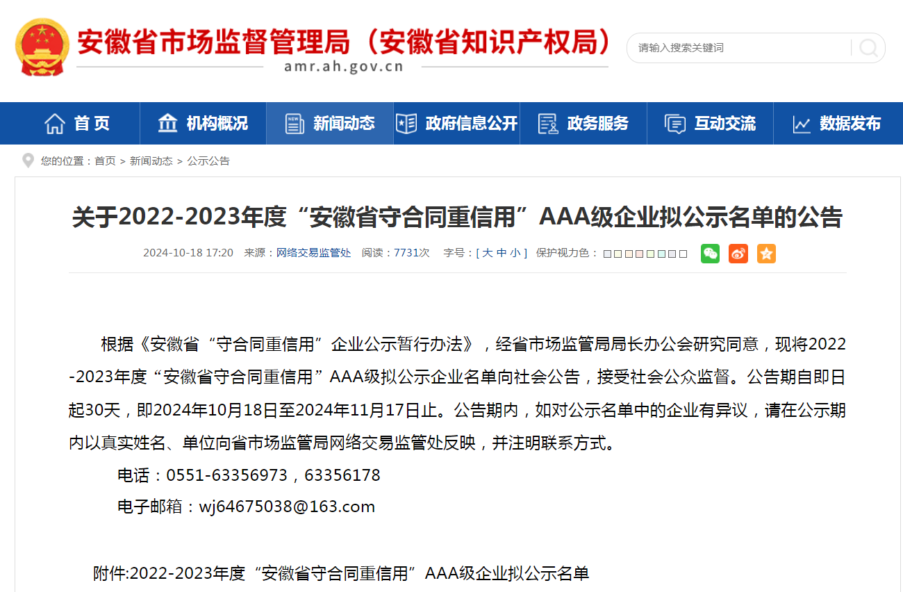 為推動企業(yè)誠信建設、賦能企業(yè)高質量發(fā)展,安徽省市場監(jiān)督管理局經統(tǒng)一部署,組織開展了2024年度安徽省“守合同重信用”企業(yè)評選公示活動,通過對申報的企業(yè)進行資料復核、征信查詢、合同執(zhí)行、業(yè)績數(shù)量、市場口碑、企業(yè)形象、行業(yè)影響等各方面進行評估,經嚴格的實地核實、綜合評判,遴選出一批行業(yè)影響力大、品牌信用度高的經營發(fā)展態(tài)勢良好的企業(yè),我公司榮幸被評選為安徽省2022-2023年度“守合同重信用AAA級企業(yè)”,省內平均每個地級市全行業(yè)僅在30家左右,含金量非常高,在此表示熱烈祝賀!