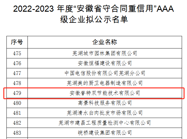信譽是企業(yè)長期穩(wěn)定發(fā)展的根基,反映企業(yè)在運營過程中的經營理念和發(fā)展宗旨,信譽程度在對外商務往來中已成為重要環(huán)節(jié)。本次入選安徽省守合同重信用AAA級企業(yè),綜合體現(xiàn)了我公司財務狀況良好、企業(yè)文化優(yōu)秀、社會信譽度高,在經營過程中無違法亂紀行為、無不良信用記錄等,樹立了良好的標桿示范形象,公司也將繼續(xù)秉承守合同重信用經營理念,為國家節(jié)能環(huán)保事業(yè)做出更大的貢獻,一諾千金,合作共贏!