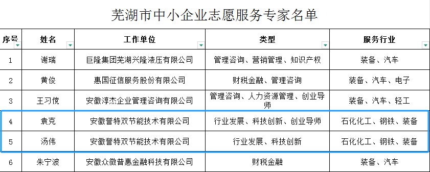 2025年3月6日,為完善蕪湖市中小企業(yè)服務(wù)體系建設(shè),促進中小企業(yè)發(fā)展,為中小企業(yè)提供優(yōu)質(zhì)高效的服務(wù),由市工信局牽頭在全市范圍內(nèi)開展志愿專家征集評選工作,并最終確定52名各行業(yè)人員組成志愿專家團,我公司總經(jīng)理袁克、節(jié)能事業(yè)部長湯偉兩位同志入選,在此表示熱烈祝賀。